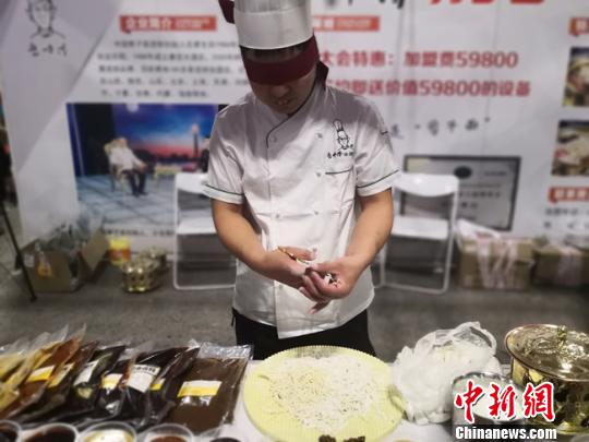 图为山西剪刀面厨师表演蒙眼剪面。 杨娜 摄