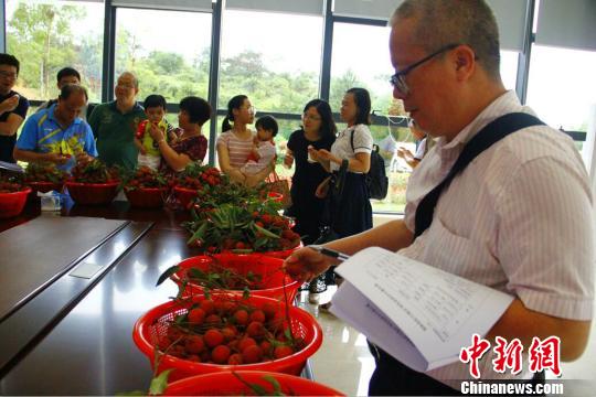 图为评比人员在计算荔枝可食率 康孝娟 摄