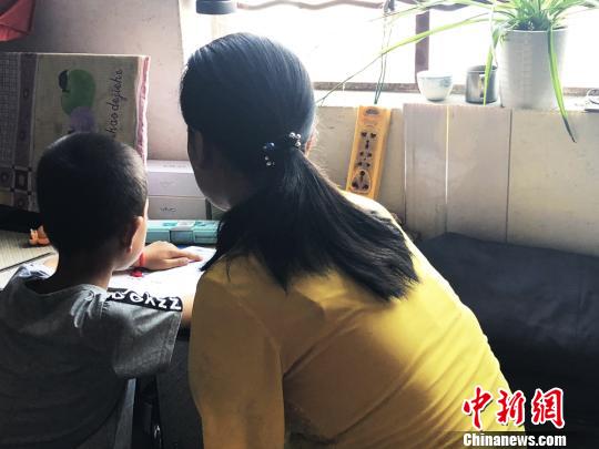 图为权红梅辅导儿子做功课。徐雪 摄