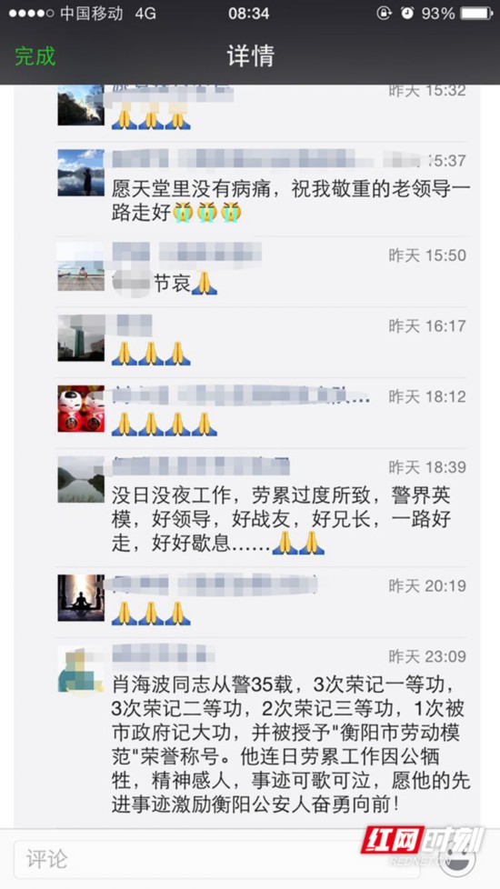 衡阳市副市长、市公安局局长胡志文难掩内心伤痛称:自己痛失一位好搭档、好兄长、好战友,从警35载的肖海波是钢筋铁骨般的硬汉,走得太突然,令人痛心扼腕。