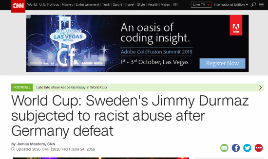 据美国有线电视新闻网(CNN)24日报道,瑞典边锋吉米·杜尔马兹在小组赛第2轮生死战给德国队制造了任意球机会之后,在社交平台受到了网友的种族歧视攻击。英国《镜报》称,杜尔马兹甚至收到了“邪恶威胁”。