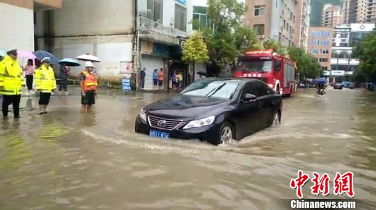 一辆汽车通过积水路段。警方供图