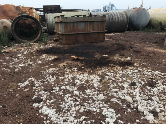 这次“回头看”下沉督察期间,督察人员在蓝丰公司的厂区看到,大量废弃反应釜、储罐、化工废桶、试剂瓶等被随意露天堆放,没有任何防护措施,堆放区域及周边有明显刺激性气味,一些废弃的反应釜有残液洒落地面并渗入土壤。