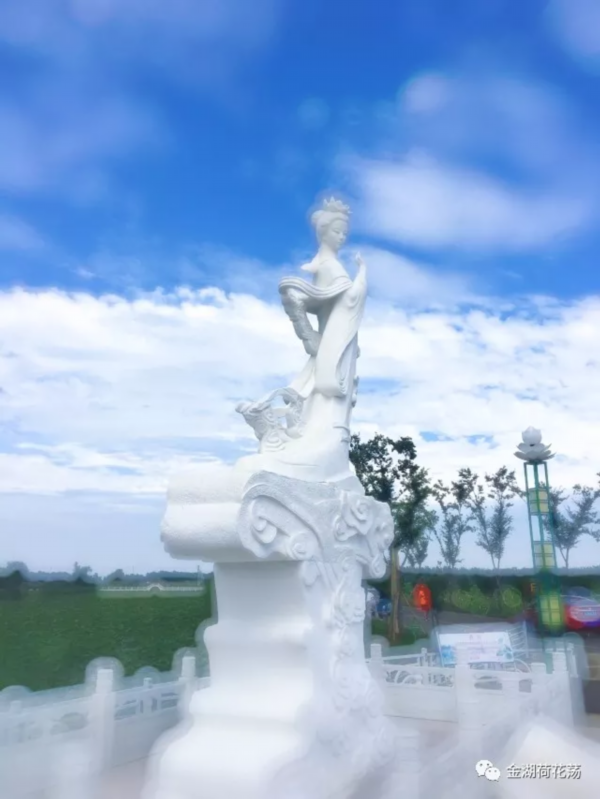 荷花荡的中心广场耸立着一尊汉白玉"荷花仙子"雕塑,这里有着一段哀婉动人的爱情故事。