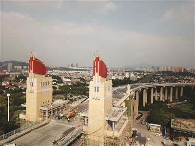 6月24日,南京长江大桥南堡公园修葺一新的米黄色桥头堡正式亮相。目前,桥头堡看台以上的围挡部分已经全部拆除。本次南京长江大桥文物修缮的原则是“修旧如故”。图为金色的旗尖和飘带在阳光下闪闪发光。 新华报业视觉中心见习记者 陈俨 摄