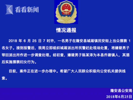 嫌疑人已被抓获,事后隆安警方对此事做了情况通报,经初查,嫌疑男子陈某泽为本县乔建镇人,其酒后实施猥亵妇女行为。
