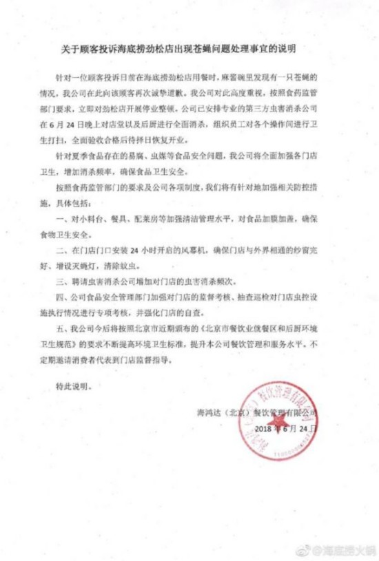 针对此事,6月24日夜间,海底捞在其官方微博发表声明称,已安排第三方虫害消杀公司在6月24日晚上对店堂及后厨进行消杀作业,并按照食药监管理部门的要求立即对劲松店开展停业整顿,待验收合格后择日恢复营业。