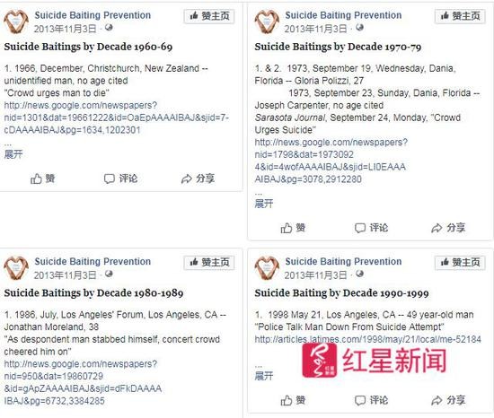 在社区主页中,她以每10年为一个列表列出了从1950年开始,因围观起哄而造成的自杀身亡事件,并附上了相关的百科及新闻链接。