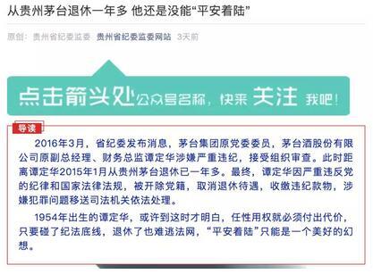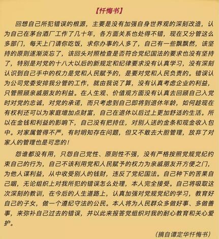 6月24日,贵州省纪委监委的官方微信公众号发布了一篇名为《从贵州茅台退休一年多 他还是没能“平安着陆”》的推文,详细讲述了茅台集团原党委委员,茅台酒股份有限公司原副总经理、财务总监谭定华的受贿细节,以及部分谭定华的忏悔书。