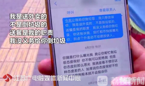 南京市民表示:“你让他倒垃圾,他帮你倒是该感谢他,不帮你倒没有必要去责怪他。”“本来外卖就挺累的,干嘛让人家倒垃圾,自己不能倒么?”