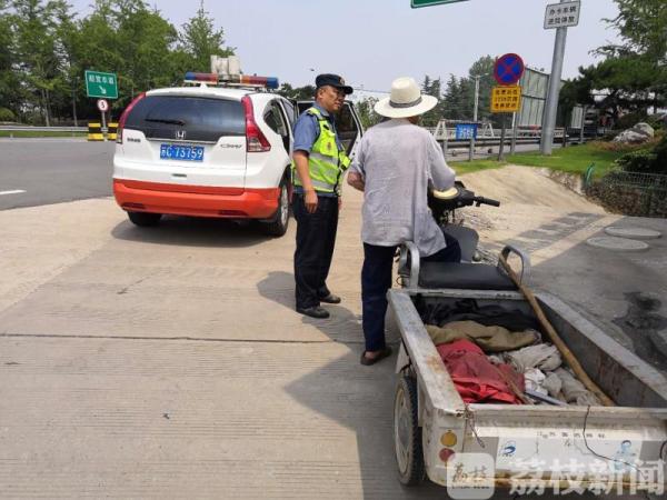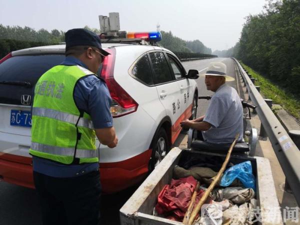 2018年6月27日9时许,江苏省高速公路交通运输执法总队连徐支队第二大队执法人员在G30邳州段执行巡查任务时发现,一位老人骑着电动三轮车在高速公路紧急停靠带上行走,非常危险,执法人员立即下车劝阻。老人显得有些生气,一心就想行走高速公路。执法人员苦口婆心地劝说老人家,行人和电动三轮车是不能上高速公路的。为了打消老人家的念头,执法人员对老人家做起了劝导工作。通过沟通了解情况得知,老人家今年已92岁高龄,独居在邳州,子女都在外地生活,当日是骑电动三轮车想从邳州去新沂买农资。执法人员善意提醒老人,夏季天气炎热,加上年事已高,不适宜独自骑电动三轮车远行。于是,执法人员将老人家送至就近的高速出口。四十多分钟后,执法人员顺利将老人家和其三轮车护送到邳州东高速出口。
