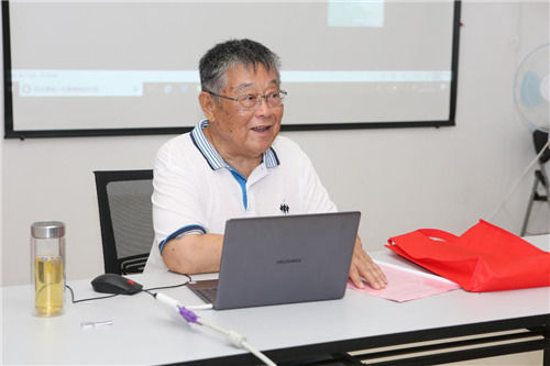 图:赵亚夫正在给社区的党员们上“七一”党课