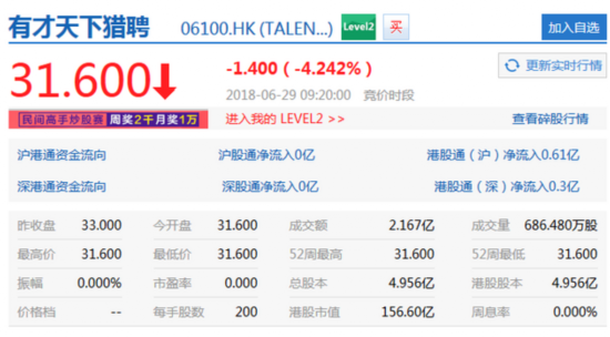 新浪科技讯 6月29日上午消息,猎聘网今日正式登陆港交所,股票代码06100。猎聘网今日开盘价31.6港元,较33港元的发行价下跌4.2%,开盘即遭到破发。若以开盘价计算,猎聘网市值156.6亿港元。