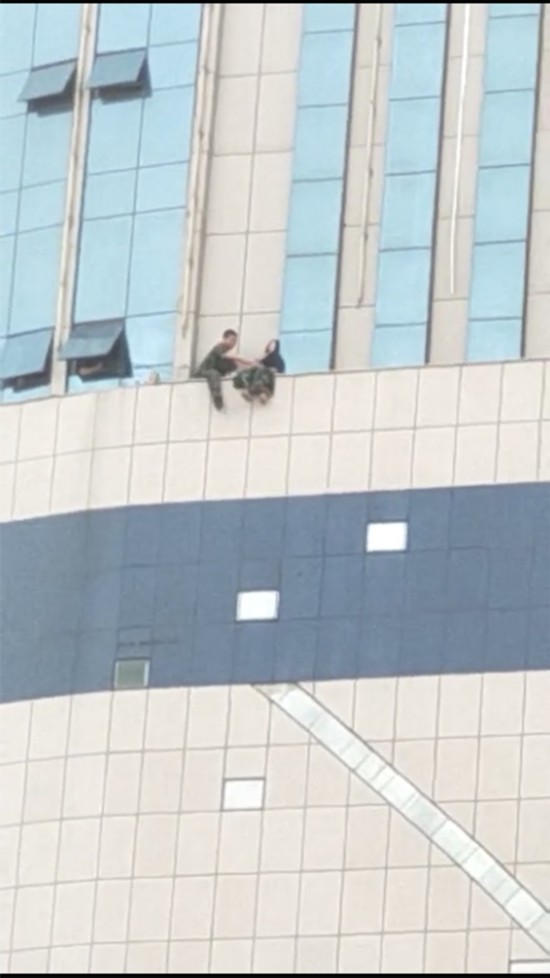 此时,常勤已经停止了录视频,后来他看到,消防员已经从窗户里跳出来,和姑娘并排坐,远看中间隔了一米多的距离。姑娘一度情绪激动,单手猛砸自己的头,砸了五六下。