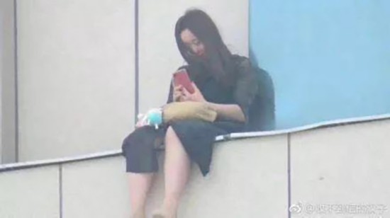 16时41分,李依依坐在天台上,手里拿着娃娃,双腿垂在挑檐下面,外窗口有人探出身子和她交涉。
