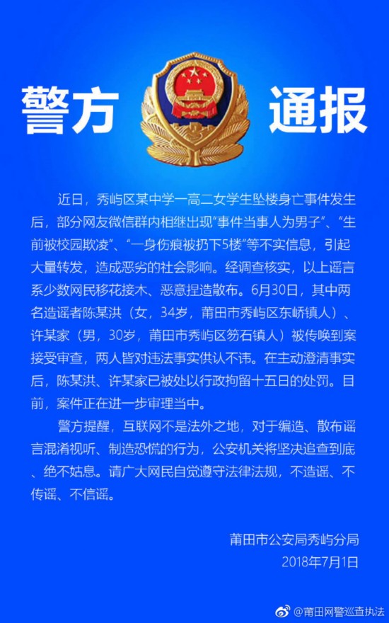 @莆田网警巡查执法 7月1日消息,近日,秀屿区某中学一高二女学生坠楼身亡事件发生后,部分网友微信群内相继出现“事件当事人为男子”、“生前被校园欺凌”、“一身伤痕被扔下5楼”等不实信息,引起大量转发,造成恶劣的社会影响。经调查核实,以上谣言系少数网民移花接木、恶意捏造散布。6月30日,其中两名造谣者陈某洪(女,34岁,莆田市秀屿区东峤镇人)、许某家(男,30岁,莆田市秀屿区笏石镇人)被传唤到案接受审查,两人皆对犯罪事实供认不讳。