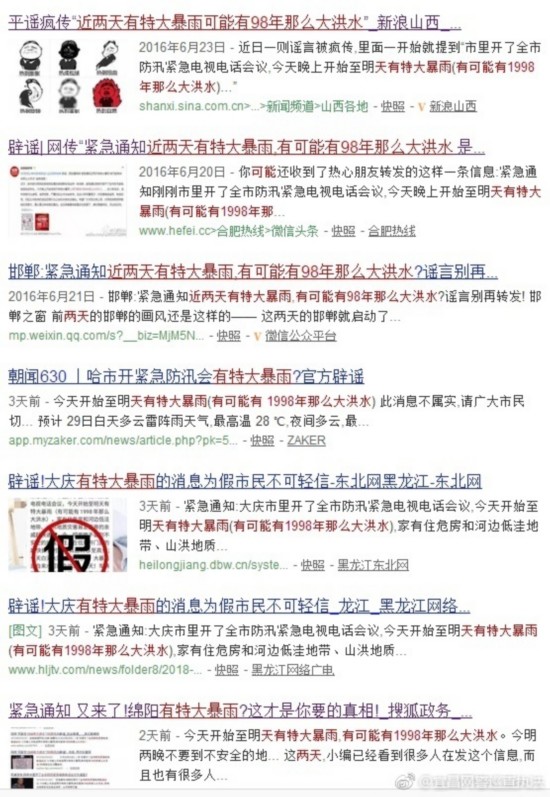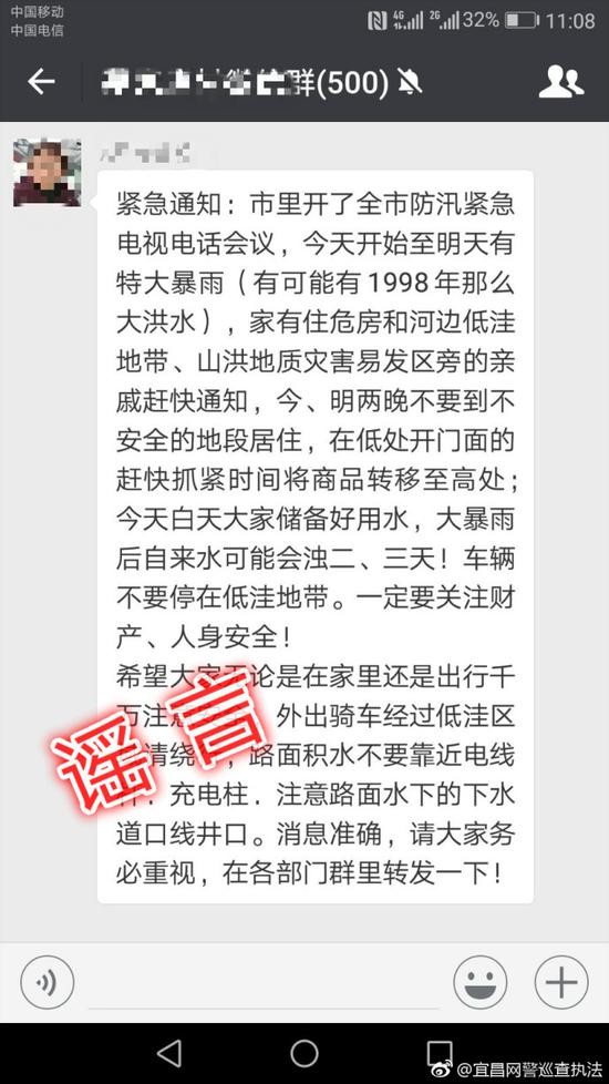 昨日宜昌迎来一场大雨,就有热心的朋友在微信群转发这样一则信息:紧急通知刚刚市里开了全市防汛紧急电视电话会议,今天晚上开始至明天有特大暴雨(有可能有1998年那么大洪水),今明两晚不要到不安全的地段居住,车辆不要停在低洼地带。该信息一出,引得人心惶惶,很多人都纷纷转发并提醒自己的亲朋好友们。