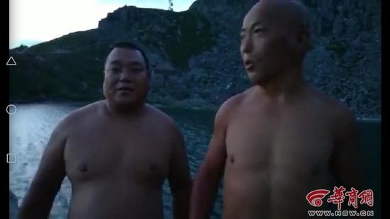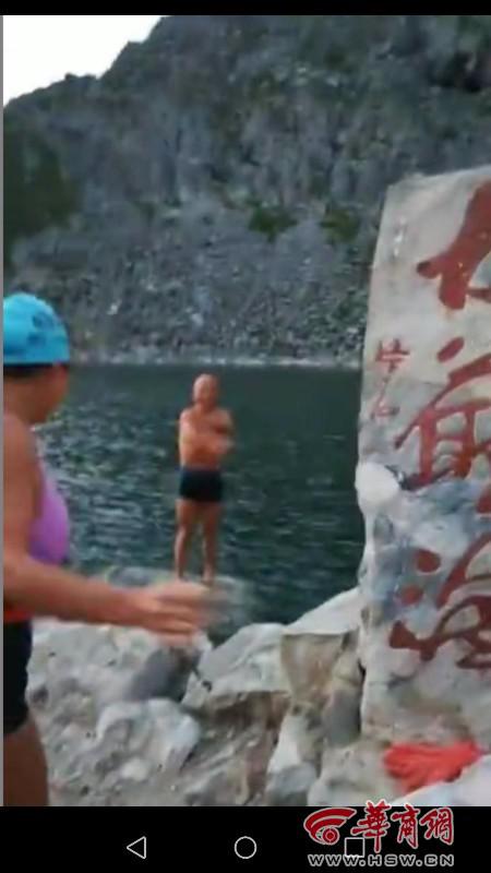 华商报记者从读者李女士的第一段视频资料看到,三名驴友穿着泳装在“大爷海”石碑前录制视频时称,‘今天是2018年6月29日,今天要挑战大爷海,现在风力5级,气温2℃左右。’随后,两名男子跳入水中,进行野游,另外一名女驴友在一旁录视频,该女驴友还不停的说着,‘真棒!来了一行八人,好多人出现了高反,不能让他们游时间太长。’