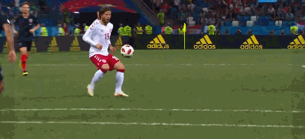 腾讯体育7月2日讯 2018年俄罗斯世界杯淘汰赛1/8决赛,克罗地亚对阵丹麦,第98分钟,丹麦大将禁区外拿球,面对防守晃出空间起脚抽射,稍稍偏出立柱。