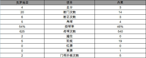 全场比赛,克罗地亚20次攻门6次射正,丹麦14次攻门3次射正,两队在120分钟时间里各入1球。克罗地亚控球率达到54%,丹麦则为46%。