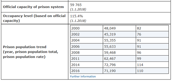 据World Prison Brief网站2018年1月公布的数据,法国监狱的容载量为59765人,而现实占用率已经达到了115.4%。