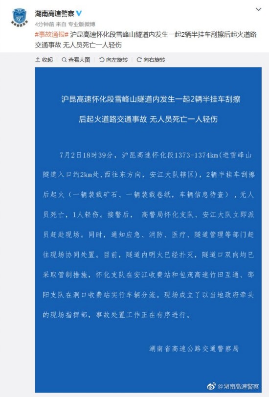 中新网7月2日电 据湖南省高速公路交通警察局官方微博消息,7月2日18时39分,沪昆高速怀化段雪峰山隧道内发生一起2辆半挂车刮擦后起火道路交通事故,无人员死亡,一人轻伤。