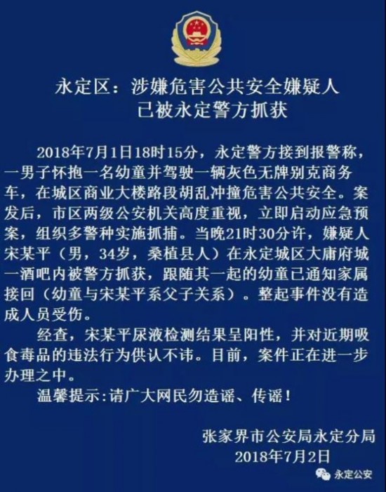 原标题:湖南永定公安通报:男子怀抱幼童驾车胡乱冲撞,承认近期吸毒