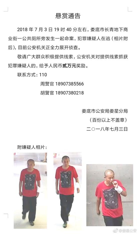 2018年7月3日19时40分左右,娄底市长青地下商业街某公共厕所旁发生一起命案,犯罪嫌疑人在逃(相片附后),目前公安机关正全力展开侦查。