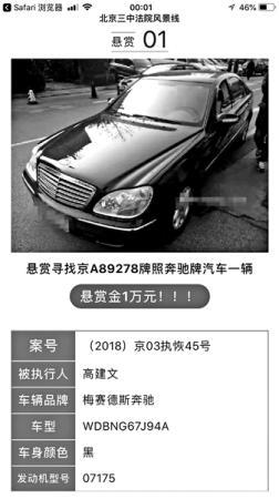 7月3日,北京三中院发布一则执行悬赏公告,分别悬赏1万元寻找两辆轿车。