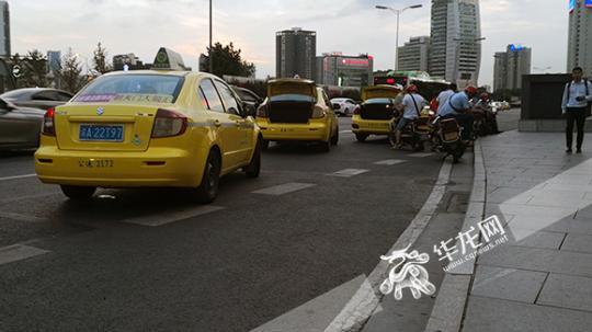 轨道嘉州路站外,揽客的出租车司机将后备箱打开,知情人表示这样可以避免被电子眼拍到。 记者 黄宇 摄