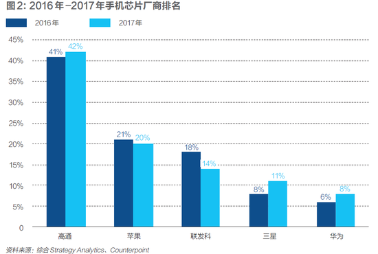 根据第三方数据统计机构Strategy Analytics 2016年发布的数据估测,未来三年高通将覆盖全球37亿部智能手机,几乎占了半壁江山。一位国内手机产品经理对《财经》记者表示,小米90%使用了高通芯片,而国内市场排名第二、三位的OPPO及vivo则采用了60%的高通芯片。这些品牌的部分旗舰机和高端机型都搭载了骁龙845芯片。