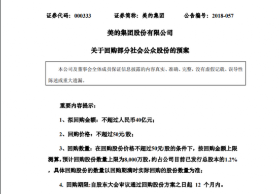 新浪科技讯 7月4日晚间消息,美的集团(000333.SZ)发布公告称,拟回购金额不超过人民币40亿元股票,回购价格为不超过50元/股,回购股份的种类为美的集团发行的A股股票。