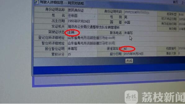 7月4日晚上7点多钟,盐城交警支队高速四大队民警在沈海高速滨海服务区对车辆进行检查时,发现一辆大型货车驾驶员没有随身携带机动车驾驶证,便对其进行详细的检查,通过警务平台查询,发现该名驾驶员今年已经六十三岁,其驾驶证的准驾车型为A2,但在2015年就被原发证机关公告注销。