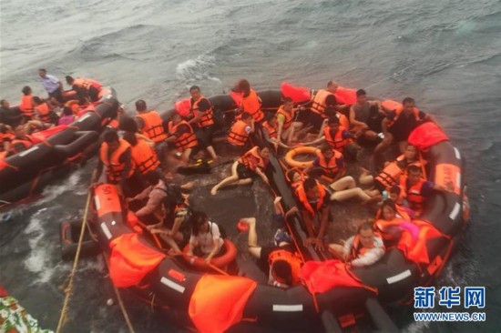 7月5日,在泰国普吉府普吉岛附近海域,翻船事故中游客被救起。新华社发
