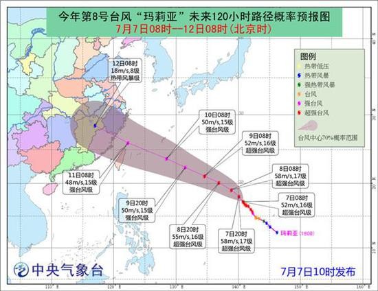 预计,“玛莉亚”将先以每小时10公里的速度向西北方向移动,8日以后移速将逐渐加快至每小时15-25公里,2天内强度变化不大,以后趋向日本冲绳群岛一带海域,10日下午移入东海东南部,逐渐向我国浙闽一带沿海靠近,并将于11日白天在上述沿海登陆,预计登陆强度可达强台风级(14-15级,45-50m/s),登陆后强度逐渐减弱。