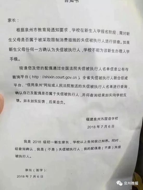 这份落款单位为福建泉州外国语学校的《告知书》在朋友圈热传,大意是,根据泉州市教育局通知要求,父母任何一方是失信被执行人的,学校不能给该新生办理入学手续。