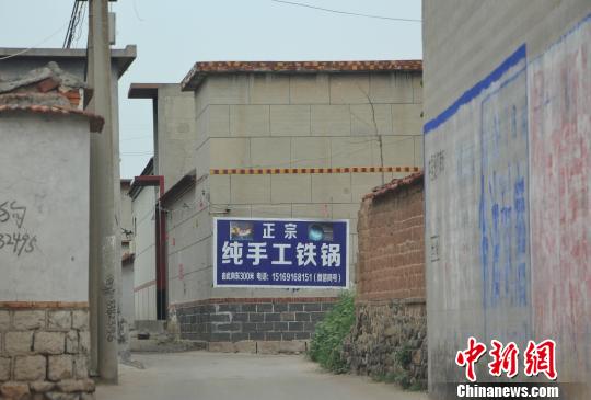 图为在章丘相公庄镇河庄村,“正宗纯手工铁锅”“舌尖上的章丘铁锅”等户外广告占据墙壁的显眼位置。 赵晓 摄
