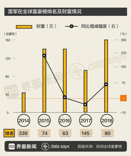 2018年2月,胡润研究院发布的《2018胡润全球富豪榜》显示,雷军排名比去年上升65位,位列第80位,财富为160亿美元,创历年之最。2014年,雷军首入全球富豪榜,现财富已翻升约260%。