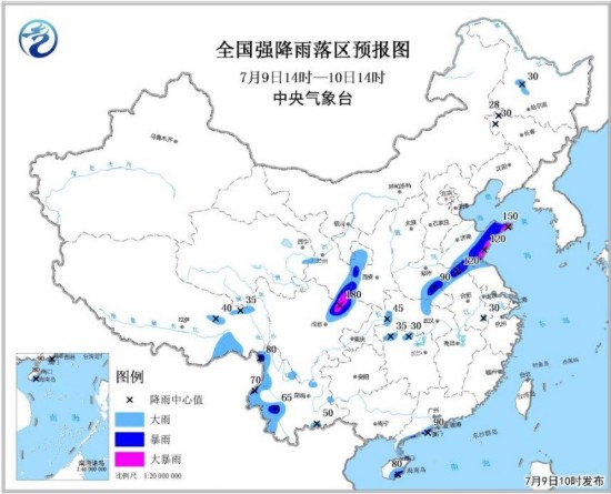 中新网7月9日电 据中央气象台网站消息,中央气象台7月9日10时发布暴雨蓝色预警:预计7月9日14时至10日14时,四川盆地西北部、甘肃东部、陕西西南部、河南东南部、山东南部和半岛地区、江苏北部、安徽北部等地的部分地区有大雨或暴雨,其中,山东东部、四川盆地西北部等地局地有大暴雨(100~180毫米);上述地区最大小时降水量30~50毫米,局地60毫米以上,并伴有雷暴大风等强对流天气。另外,云南西部、华南中东部有分散性大雨,局地有暴雨。