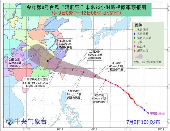 大风预报:9日14时-10日14时,台湾东北洋面和东海南部的中东部海域的风力将逐渐加大到7-10级,部分海域风力可达11-12级;琉球群岛以东洋面将有9-12级大风,台风“玛莉亚”中心经过的附近洋面的风力有13-17级。