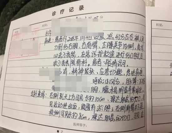 “那天大概凌晨2点多,我快睡了,听到门铃响了,第一遍我没管,以为谁摁错了。第二遍响,我走过去看了下,听到她说自己被抢劫,还受了伤。”黄小妮的朋友回女士告诉记者,她下楼大约10分钟左右,民警便赶了过来,之后120救护车也过来了。医务人员对黄小妮的伤口紧急处理后,把她送上救护车运往附近的德济医院救治。黄小妮的病历显示,德济医院接诊时间为7月4日2时45分。