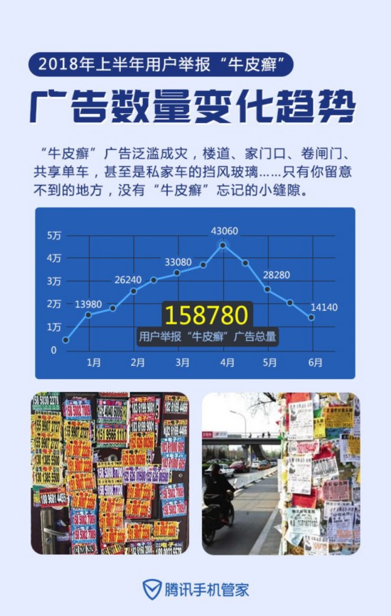如何从根本上防御牛皮癣小广告带来的风险?近日,基于“举报街边牛皮癣”功能,腾讯手机管家发布了《2018年上半年“牛皮癣”广告数据报告》(以下简称“报告”),对牛皮癣小广告举报数量和类型、地域特征进行分析,同时揭露牛皮癣小广告背后的黑产,引导用户积极参与线上举报公益行动,从源头上杜绝诈骗风险。