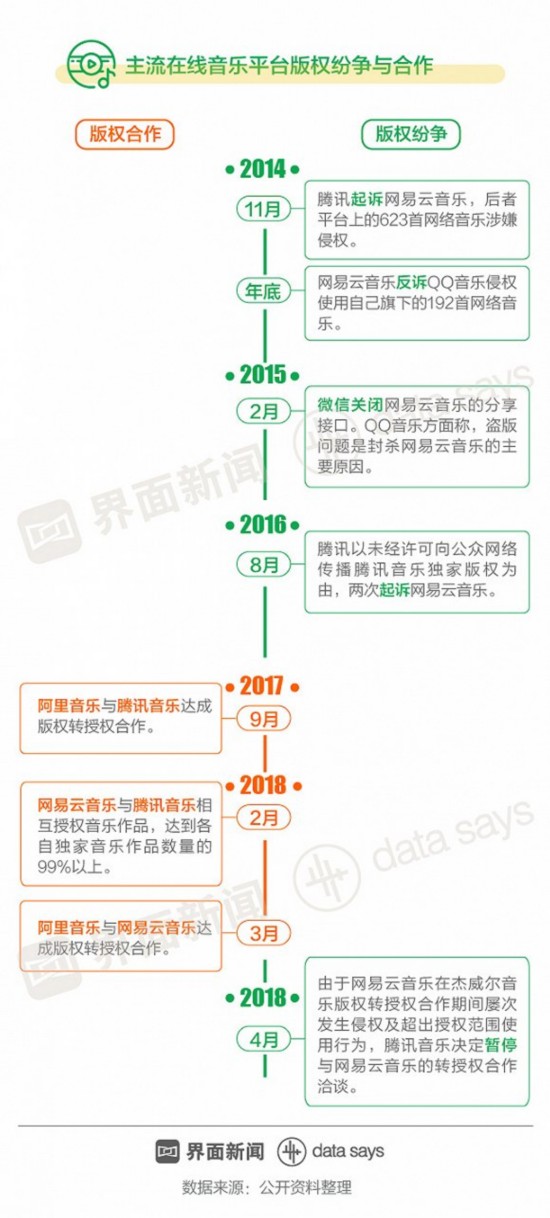 从2014年开始,腾讯和网易云音乐因为版权问题频频“交手”,多次互相起诉对方侵权。2018年2月,在官方层面的推动下。网易云音乐和腾讯音乐终于达成版权合作。