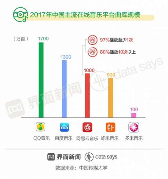 中国传媒大学在2017年9月发布发布的《中国数字音乐产业发展报告》显示,QQ音乐的曲库规模最大,达到1700万首。网易云音乐虽然在曲库规模上不占优势,但其用户忠诚度和参与度较高,97%的歌曲都被完整聆听至少1次。