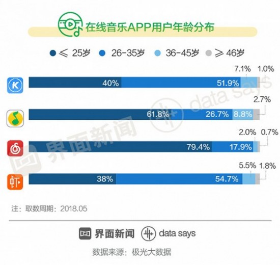 网易云音乐最受25岁以下年轻用户的青睐,QQ音乐次之。虾米音乐和酷狗音乐的用户年龄大多在26-35岁之间。