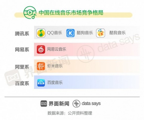 经过多年的各方混战,如今中国在线音乐市场已基本形成“四强争霸”的格局。其中,腾讯旗下拥有QQ音乐、酷狗音乐和酷我音乐三大在线音乐产品。