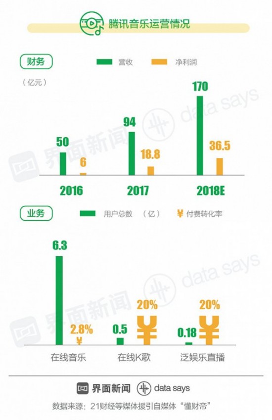 21世纪经济报道等媒体援引自媒体“懂财帝”爆料称,预计2018年腾讯音乐营收将超过170亿元,净利润达到36.5亿元。腾讯线音乐业务的用户总数达到6.3亿,但付费转化率仅为2.8%。