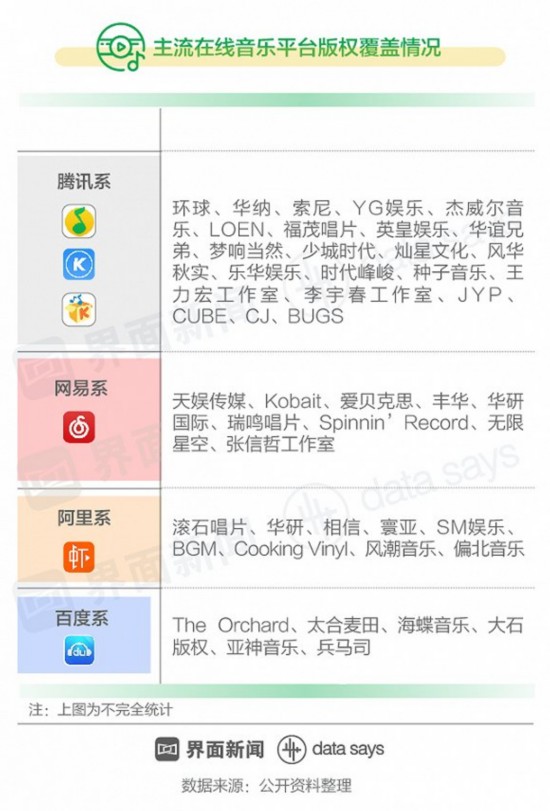 随后,各大在线音乐平台开始修筑版权壁垒。据界面新闻记者不完全统计,目前腾讯音乐的版权覆盖面最广,至少拥有22家唱片公司版权,其中包括环球、华纳、索尼三巨头。