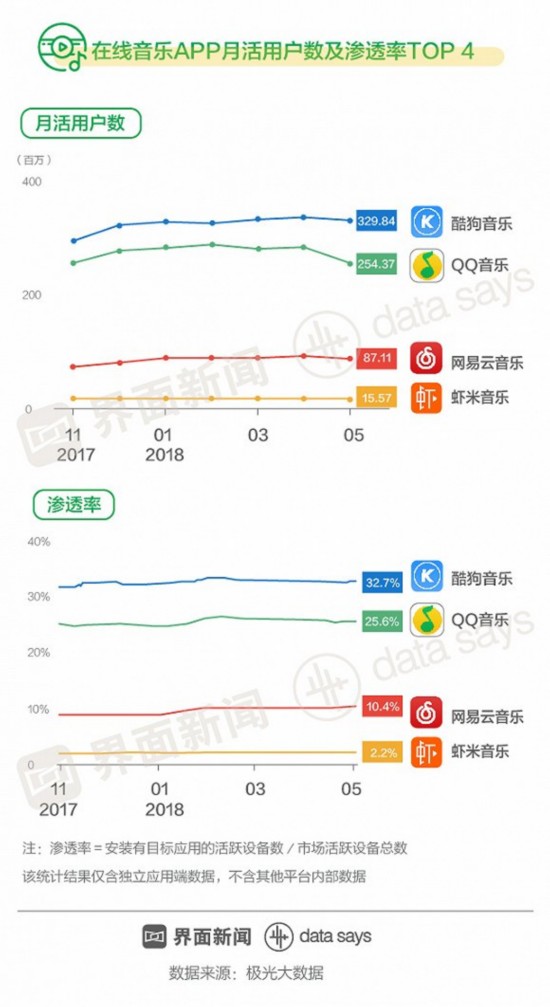 从APP数据来看,酷狗音乐、QQ音乐、网易云音乐和虾米音乐稳坐中国在线音乐行业的头四把交椅。其中,腾讯系产品的月活跃用户总数接近6亿。