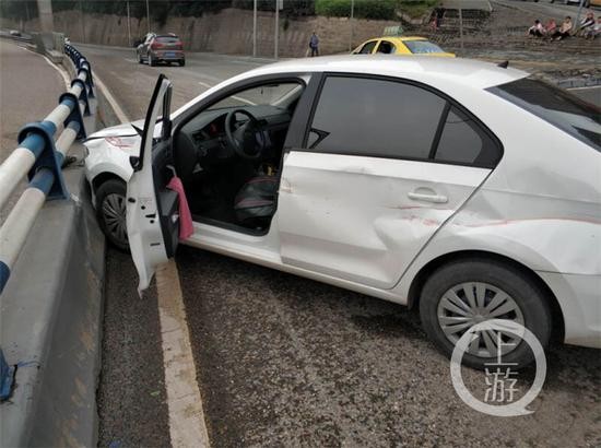 最终汤先生的小轿车撞击到中央隔离护栏后,停了下来。